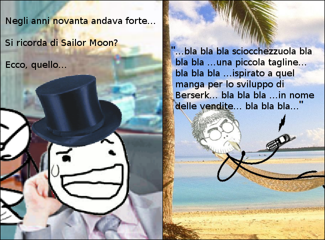E mentre ti ritrovi li a pensare come mai faccia uscire un fumetto di Berserk all’anno quando va bene qualche domanda devi pur fartela. Kentaro, ma come cavolo fai a prenderti continuamente pause? Sei stressato? Annoiato? Essere ricco sfondato ti ha tolto la voglia di lavorare/fare contenti i tuoi fan? E la risposta me la sono pure data. Da qui la mia collaborazione con Ade, admin di meme-italia.it. E ne è venuto fuori proprio un bel fumetto.
