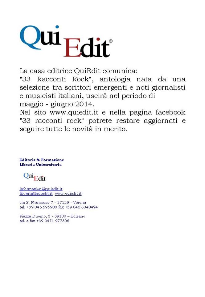 Dopo una lunga attesa, finalmente è stata comunicata una data per l’uscita di “33 Racconti Rock”, raccolta di storie inedite alla quale ho preso parte.  L’uscita dell’antologia è prevista tra maggio e giugno 2014.