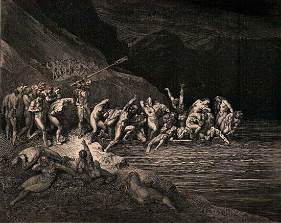 Caronte, stupefatto da un così magistrale utilizzo del latinorum, caricò i due pellegrini sulla chiatta e li traghettò fino all’altra sponda del fiume infernale, senza importunarli ulteriormente.