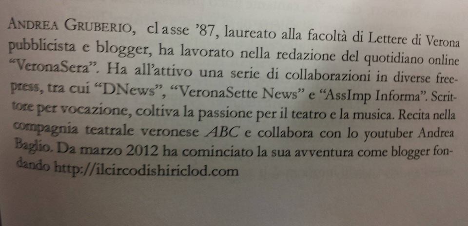 Devo dire che ho provato una strana sensazione rileggendo quelle poche righe che la casa editrice mi ha chiesto per descrivermi. A parte un piccolo refuso (il Circo è nato nel 2013  e non nel 2014, ndr), ho avuto la possibilità di rileggere ciò che consideravo come l’immagine del sottoscritto qualcosa come un anno fa. Quante cose possono cambiare in un solo anno. Tutto scorre, è proprio vero. E bisogna continuare a muoversi ricordando nel contempo ogni persona che si è stati*, sognando chi si sarà domani.