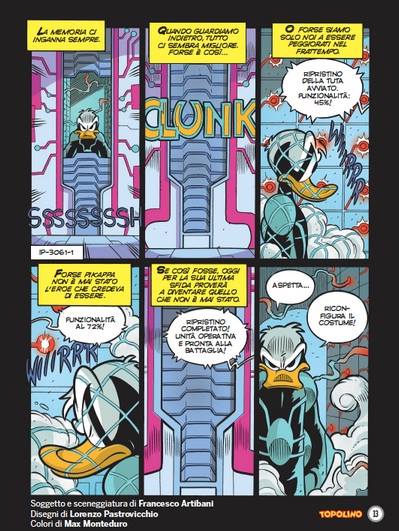 Un personaggio diventa il beniamino del pubblico quando permette ai lettori di identificarsi con lui: Artibani permette a Paperinik di gettare la maschera: quel piccolo papero è uno di noi. Adrenalina ed emozioni non si risparmiano nel capitolo finale: dopo l’incipit e due numeri di contorno in cui è stata preparata la scacchiera per la resa dei conti, finalmente ci siamo. C’è anche il tempo per un ricordo, il più toccante: quello avvenuto sul primo albo di PK².